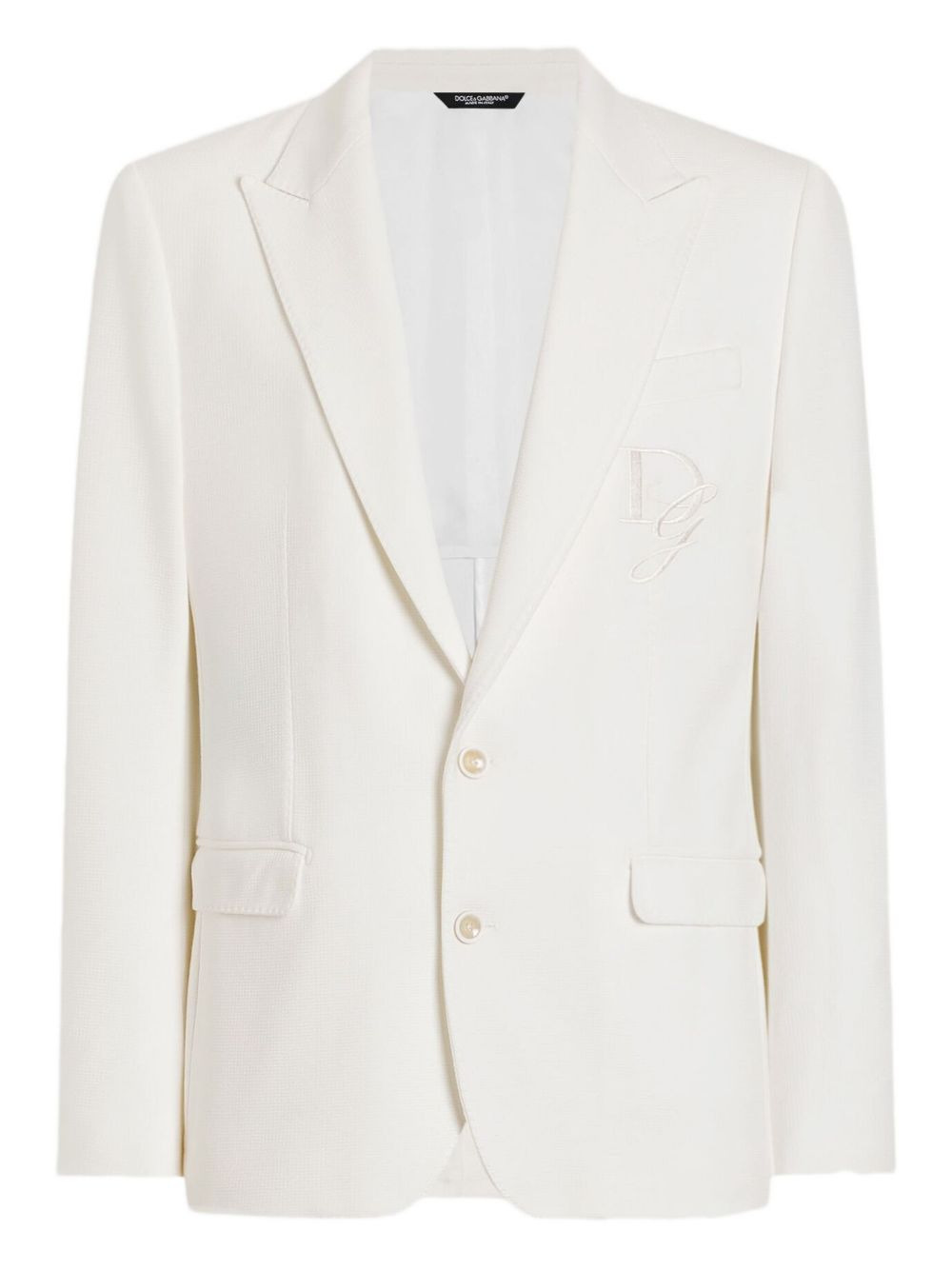 embroidered single-breasted blazer Highlights - White - Single-breasted closure - Embroidered logo - Peaked lapel - Two-button fastening - Flap pockets Made in Italy Composition Outer: Viscose 76%, Polyamide 22%, Elastane 2% Lining: Polyester 55%, Viscose 45% Washing instructions Read Manufacturer Guidelines