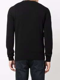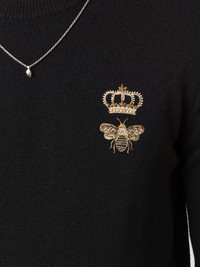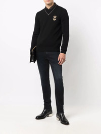embroidered virgin wool jumper black/gold virgin wool fine knit embroidered design crew neck long sleeves straight hem Made in Italy Composition Virgin Wool 100%, Polyester 35%, Polyamide 25%, Metallized Polyester 20%, Viscose 20% SIZE & FIT Model measurements Height 6 ft 3 in(1.9 m) Bust/Chest 38.18 in(97 cm) Hips 37.79 in(96 cm) Waist 32.67 in(83 cm) FittingInformation Designed to be unstructured, offering a loose fit throughout Made with a lightweight knit, this piece offers some stretch This piece fits true to size – take your usual size Measurement CHEST 39.37 in(100 cm) LENGTH 25.98 in(66 cm) SLEEVE LENGTH 26.37 in(67 cm) Washing instructions Dry Clean Only