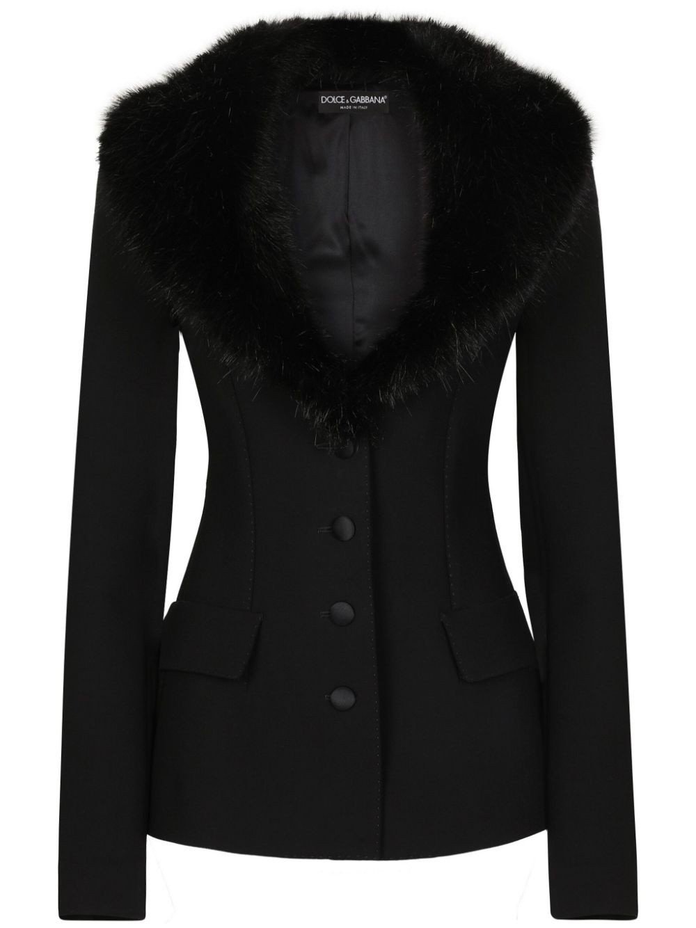 faux-fur collar jacket Highlights - Black - Faux-fur collar - Detachable collar - Long sleeves - Front button fastening - Two side flap pockets - Curved hem Made in Italy Composition Lining: Silk 73%, Virgin Wool 20% Outer: Virgin Wool 60%, Polyamide 37%, Spandex/Elastane 3%