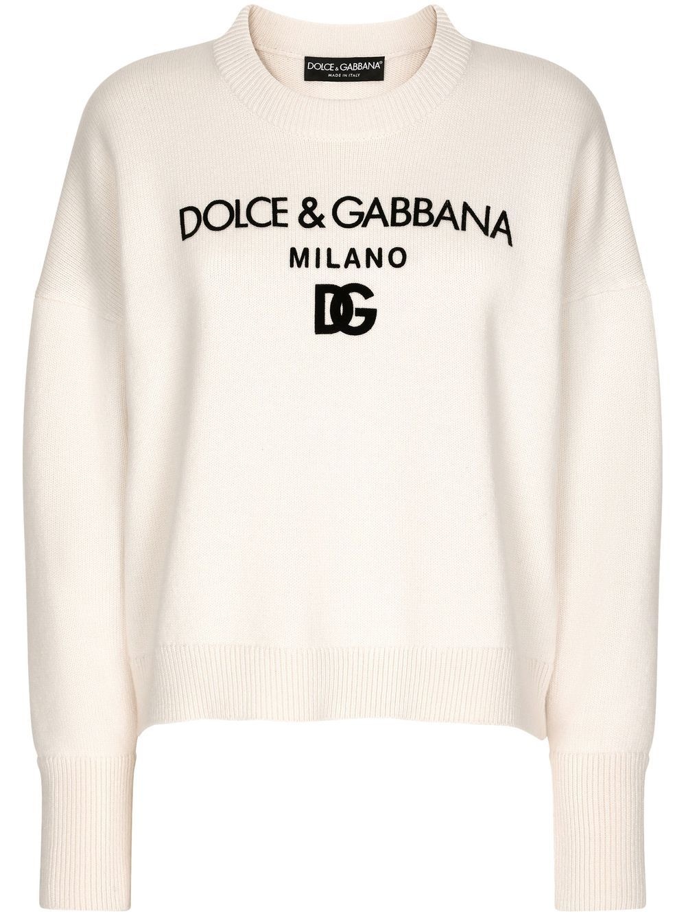DG-logo cashmere jumper Spun from cream-white cashmere, this Dolce & Gabbana jumper has a relaxed silhouette. The oversized knit is adorned with the brand's logo lettering in a flocked construction across the chest. Highlights - Flocked-logo cashmere jumper from dolce & gabbana featuring cream white, cashmere, crew neck, drop shoulder, long sleeves, flocked logo, straight hem and ribbed-knit edge. Made in Italy Composition Cashmere 100% Washing instructions Read Manufacturer Guidelines