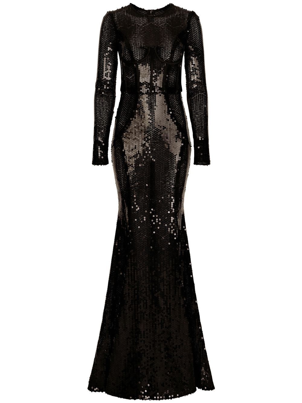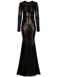 corset-detail sequinned gown Dolce & Gabbana showcases a shimmering aesthetic with this evening dress. The floor-length silhouette plays host to an eye-catching sequin design while the corset detailing lends an added structure to the piece. Highlights - Black - Sequin design - Round neck - Long sleeves - Corset style - Flared hem - Floor-length Made in Italy Composition Outer: Nylon 50%, Silk 45%, Elastane 5% Lining: Polyester 60%, Nylon 40% SIZE & FIT Measurement HIPS 31.49 in(80 cm) WAIST 24.4 in(62 cm)