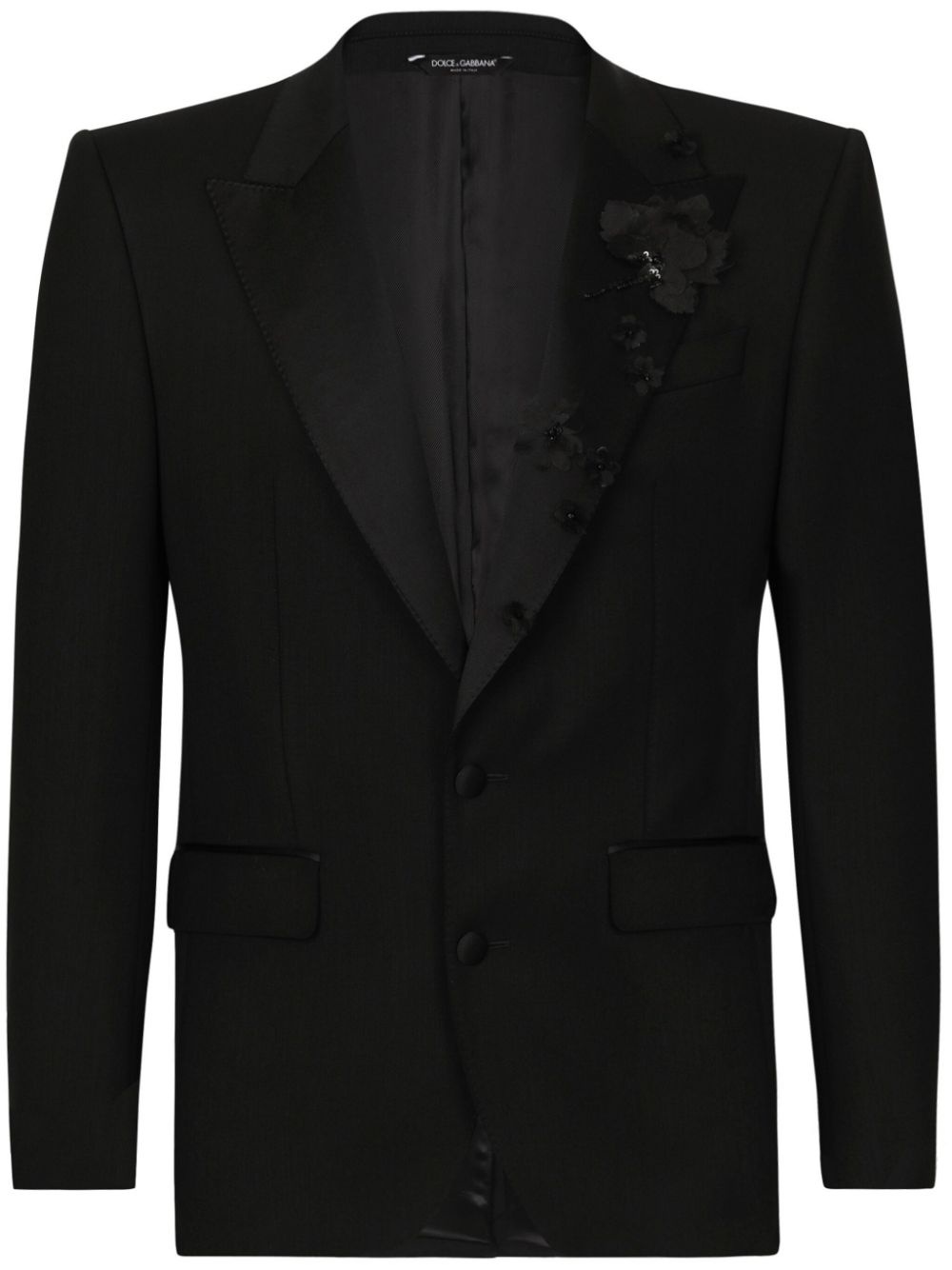 floral-applique single-breasted suit Running away from the brand's usual bold prints and colours, this single-breasted suit from Dolce & Gabbana is presented in black colour. Floral appliques at the chest highlight its design. Highlights - Black - Virgin wool blend/silk blend Made in Italy Composition Outer: Virgin Wool 85%, Silk 10%, Elastane 3%, Polyester 2% Lining: Viscose 100%