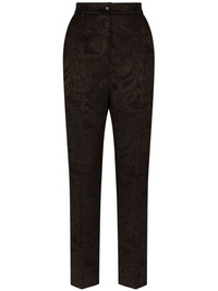floral-jacquard tapered-leg trousers Dolce & Gabbana reimagines the classic tapered trouser with their signature style. Decorated in a floral applique all over the design and sealed with the house’s instantly recognisable DG logo established with the brand back in 1985. Highlights - Black - Stretch-design - Floral applique - Logo-embossed button - Belt loops - High waist - Button fly fastening - Tapered leg - Ankle-length Made in Italy Composition Polyester 57%, Acetate 24%, Rayon 17%, Spandex/Elastane 2%