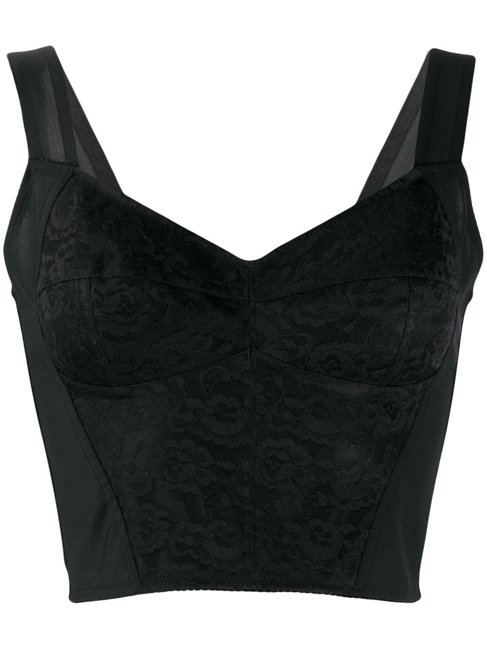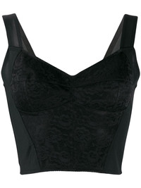 jacquard corset bustier Highlights - Keep it short and sweet. this black floral lace bustier top from dolce & gabbana is the way to go. what it lacks in length (definitely) makes up for in personality. featuring a sweetheart neckline, a fitted silhouette, an open back, a floral lace pattern, a back zip fastening and shoulder straps. Made in Italy Composition Outer: Polyamide 87%, Spandex/Elastane 13% Lining: Polyamide 100% SIZE & FIT Model measurements Height 5 ft 10 in(1.77 m) Bust/Chest 35.03 in(89 cm) Hips 35.03 in(89 cm) Waist 23.62 in(60 cm) FittingInformation This piece fits true to size. We recommend you get your regular size Cut for a close fit Made with a mid-weight stretch fabric Washing instructions Dry Clean Only