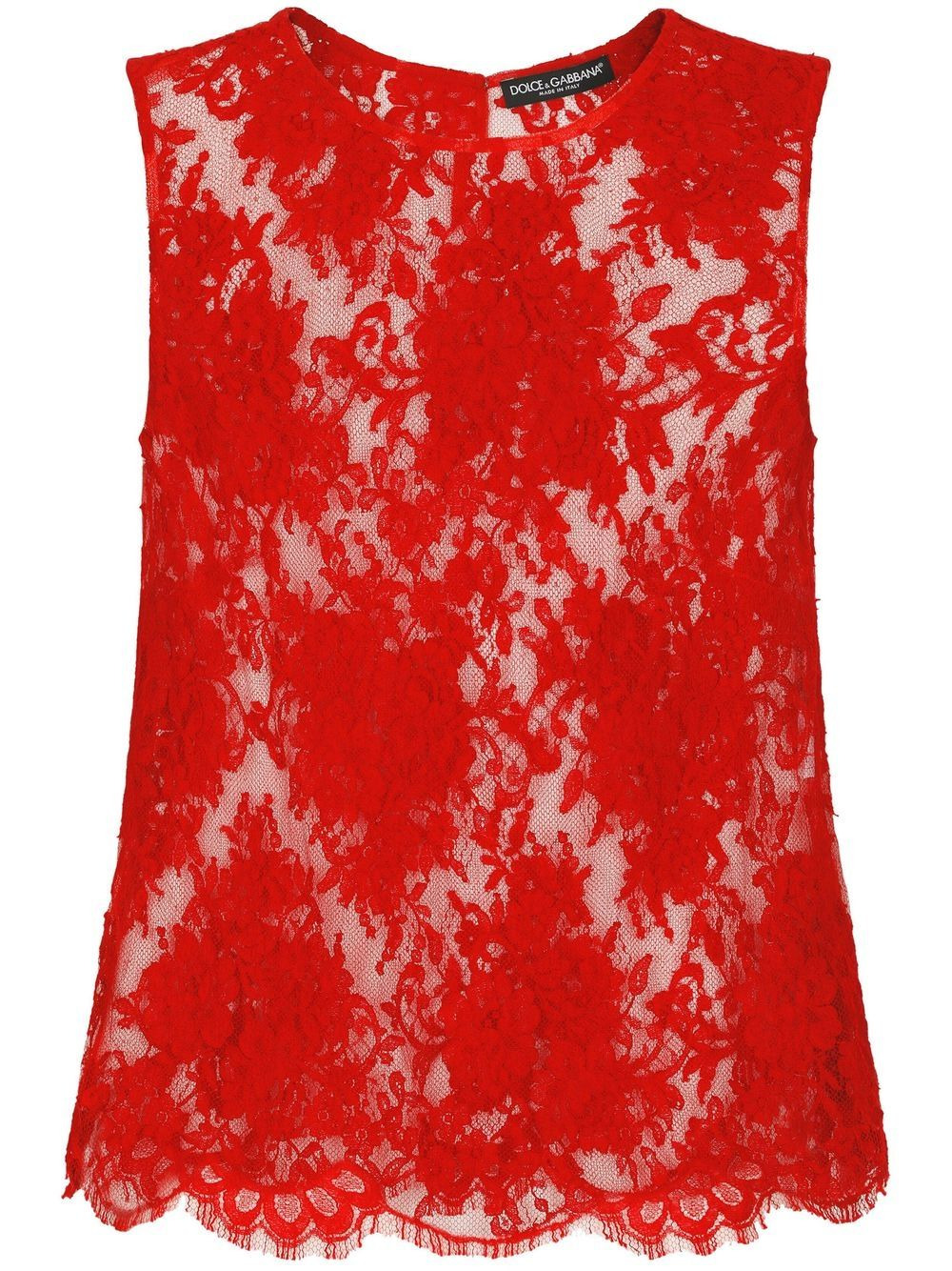 chantilly-lace sleeveless top Dolce & Gabbana's theatrical and gothic-inspired approach to garments is channelled for SS23, as shown by this red sleeveless top. Here, a floral lace overlay elevates this sleeveless bright red silhouette that falls into a scalloped hem. Highlights - Floral lace scalloped hem top from dolce & gabbana featuring brick red, cotton blend, floral-lace detailing, sleeveless, round neck, scallop hem and concealed rear zip fastening. Made in Italy Composition Cotton 77%, Nylon 23%