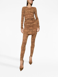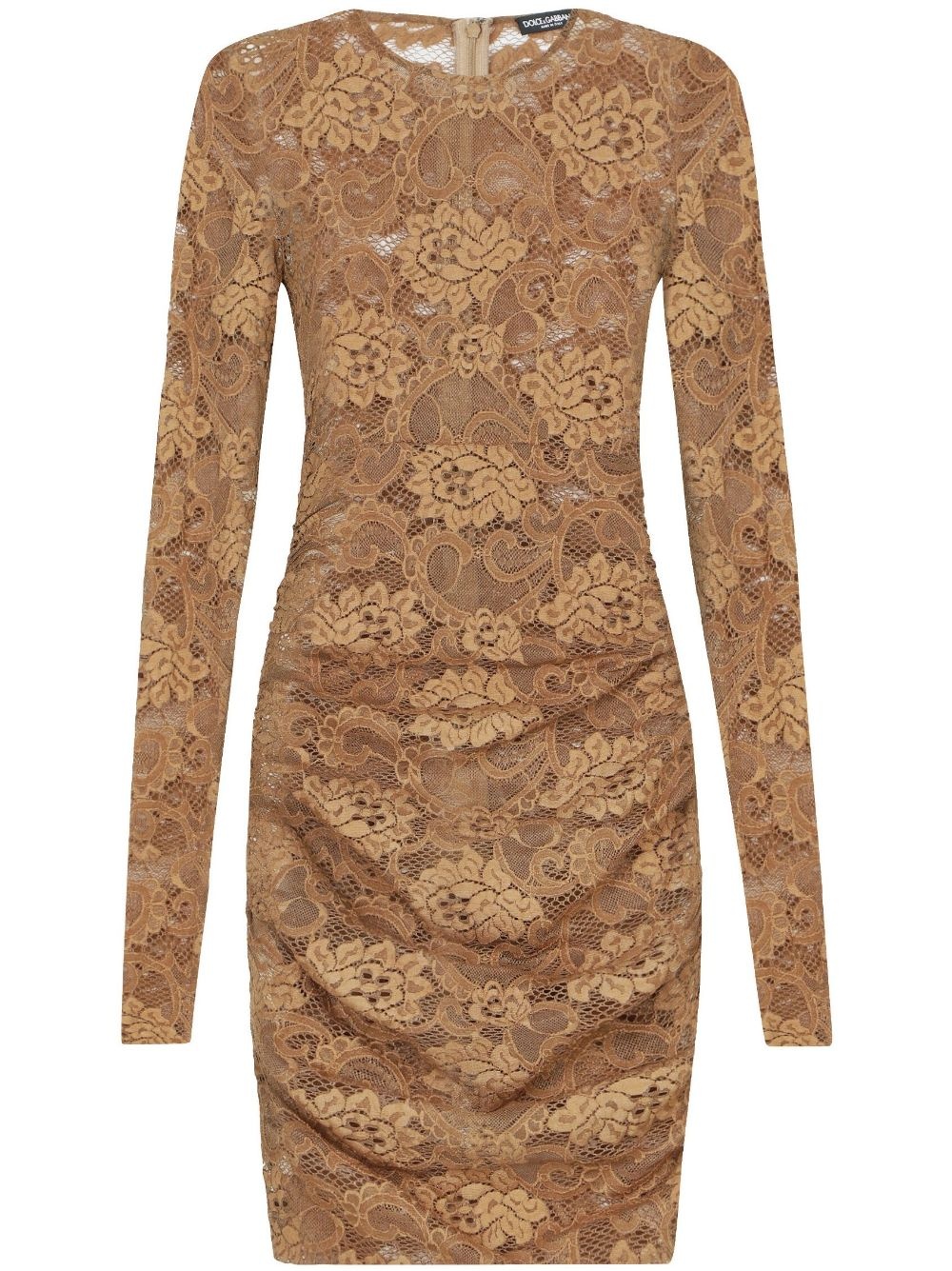 floral-lace semi-sheer minidress Made from intricately embroidered floral lace, this beige Dolce & Gabbana minidress reflects the Italian brand's exquisite craftsmanship. In contrast to the ornate fabric, the silhouette is comparatively simple, complete with a crew neck and long sleeves. Highlights - Light brown - Stretch-silk - Chantilly lace - Semi-sheer construction - Round neck - Concealed rear zip fastening - Long sleeves - Straight hem - Above-knee length Made in Italy Composition Lining: Silk 91%, Spandex/Elastane 9% Outer: Nylon 85%, Spandex/Elastane 15%