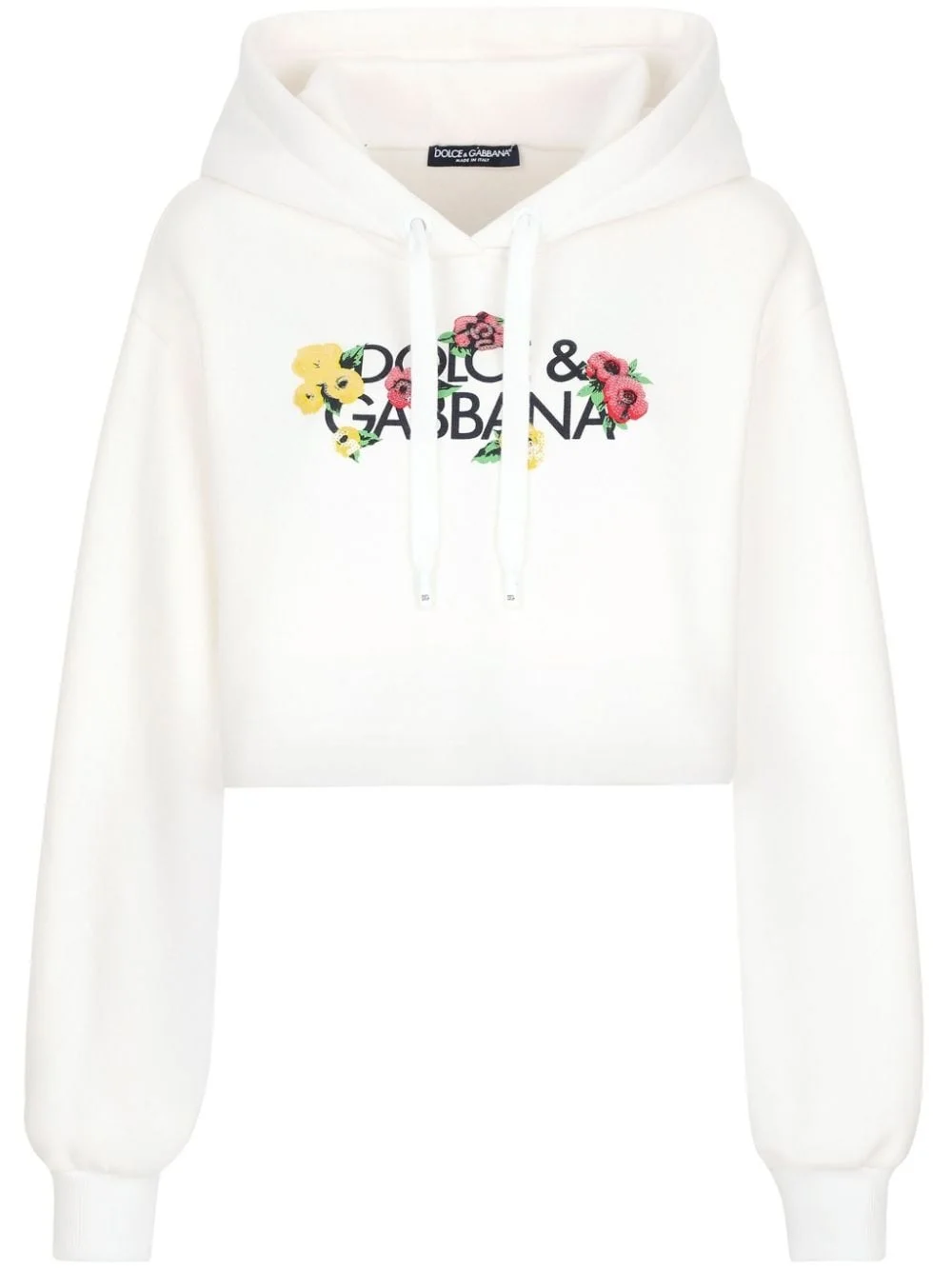 floral-logo cropped hoodie Highlights - White/multicolour - Cotton - Logo print to the front - Floral print to the front - Drawstring hood - Long sleeves - Cropped - Straight hem Made in Italy Composition Cotton 100% Washing instructions Read Manufacturer Guidelines