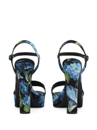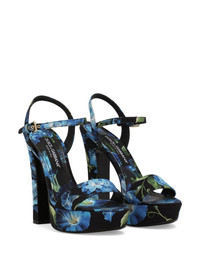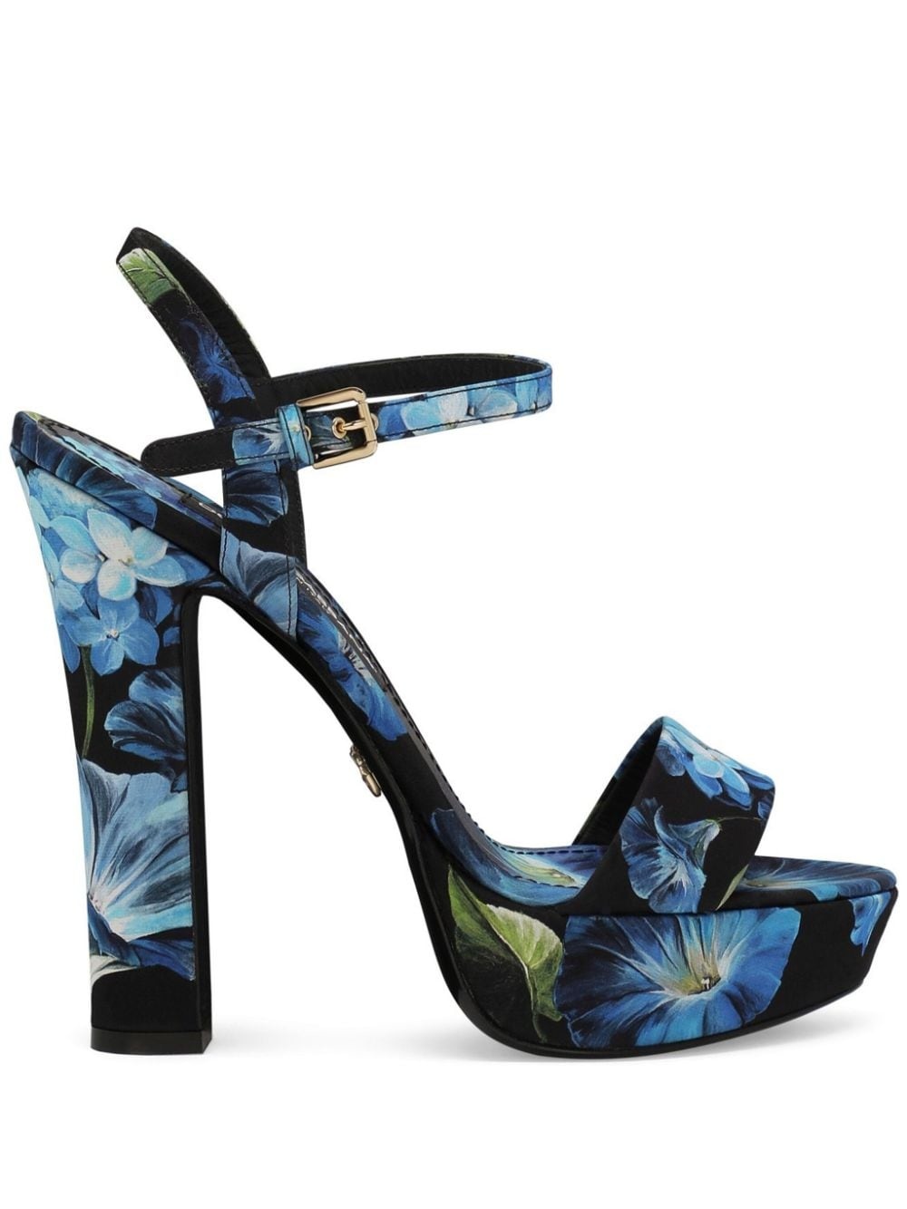 floral-print charmeuse platform sandals Dolce & Gabbana's love of florals takes centre stage in these sandals. Crafted from stretch silk charmeuse, they boast a bold silhouette thanks to a thick platform sole and dizzying block heel. They are steeped in a blue bellflower print, evoking a romantic, lush look. Highlights - Sky blue/black - Stretch-silk - Charmeuse - All-over floral print - Gold-tone hardware - Open toe - Single toe strap - Buckle-fastening ankle strap - Block heel - Branded insole - Platform sole Made in Italy Composition Silk 100%