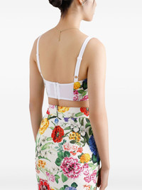 floral-print crop top Highlights - White - Rear hook and eye fastening - Adjustable spaghetti straps - Sweetheart neck - Straight hem Made in Italy Composition Outer: Cotton 70%, Polyamide 24%, Spandex/Elastane 6% Lining: Cotton 97%, Spandex/Elastane 3%
