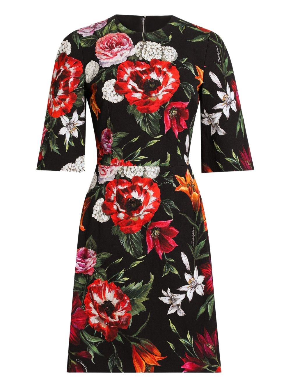 floral-print mini dress Highlights - Black - Concealed rear zip fastening - Crew neck - Half-length sleeves - Straight hem Made in Italy Composition Outer: Viscose 48%, Cotton 48%, Elastane 2%, Polyamide 2% Lining: Silk 91%, Elastane 9%