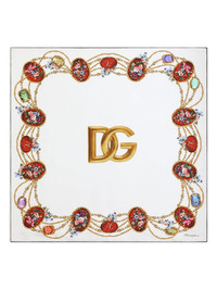 floral-print scarf Highlights - White and multicolour - Floral print - Logo - Jewel detail - Chain embellishment - Border print Made in Italy Composition Silk 100% SIZE & FIT Measurement LENGTH 35.43 in(90 cm) WIDTH 35.43 in(90 cm)
