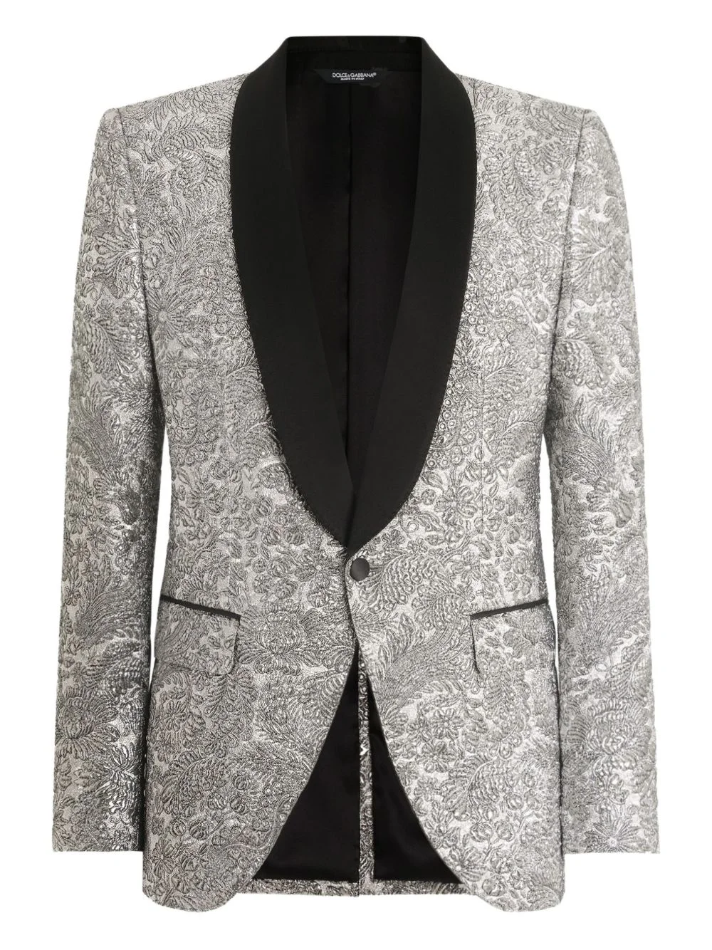 floral single-breasted blazer Highlights - Silver-tone - Floral pattern - Single breasted - Shawl lapel - Button fastening - Welt pockets Made in Italy Composition Outer: Acrylic 28%, Metallized Polyester 28%, Silk 22%, Virgin Wool 14%, Polyamide 5%, Polyester 3% Lining: Silk 100% Washing instructions Read Manufacturer Guidelines