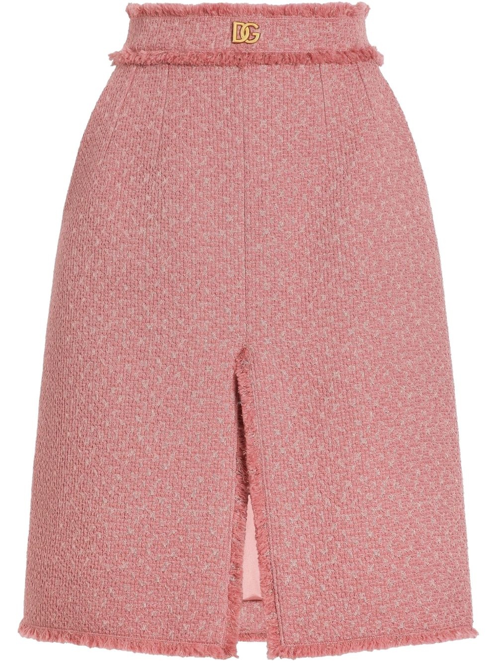 DNA front slit skirt Highlights - Powder pink - Concealed rear zip fastening - Two side slit pockets - Fringed edge Made in Italy Composition Outer: Virgin Wool 67%, Viscose 27%, Polyamide 6% Lining: Silk 92%, Spandex/Elastane 8%