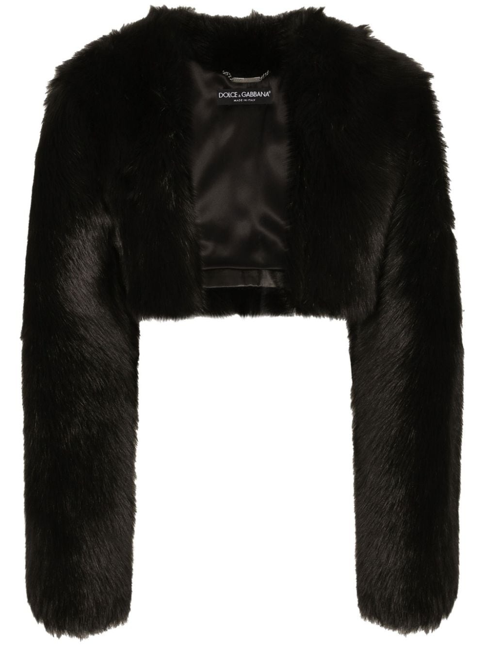 fur cropped jacket Highlights - Black - Faux-fur design - Satin finish - Open front - Collarless - Long sleeves - Straight hem - Cropped Made in Italy Composition Outer: Lamb Fur 100% Lining: Silk 90%, Lamb Fur 10%