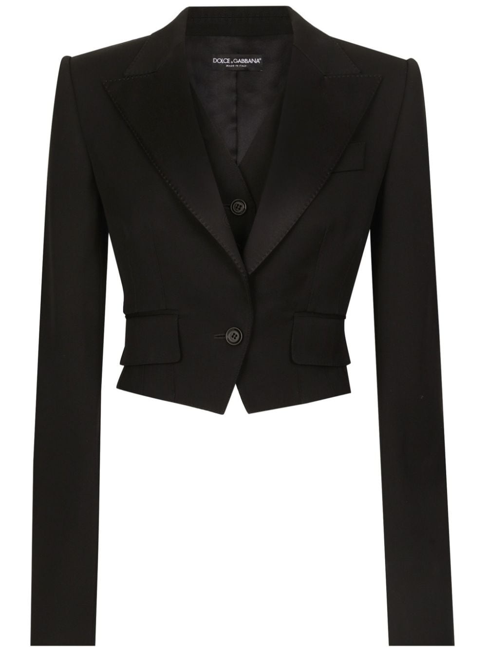 gabardine cropped jacket Highlights - Black - Virgin wool blend - Gabardine weave - Peak lapels - Long sleeves - Buttoned cuffs - Front button fastening - Faux pocket detail - Cropped - Satin lining - Internal vest Made in Italy Composition Lining: Silk 100% Outer: Virgin Wool 83%, Silk 13%, Polyester 4%