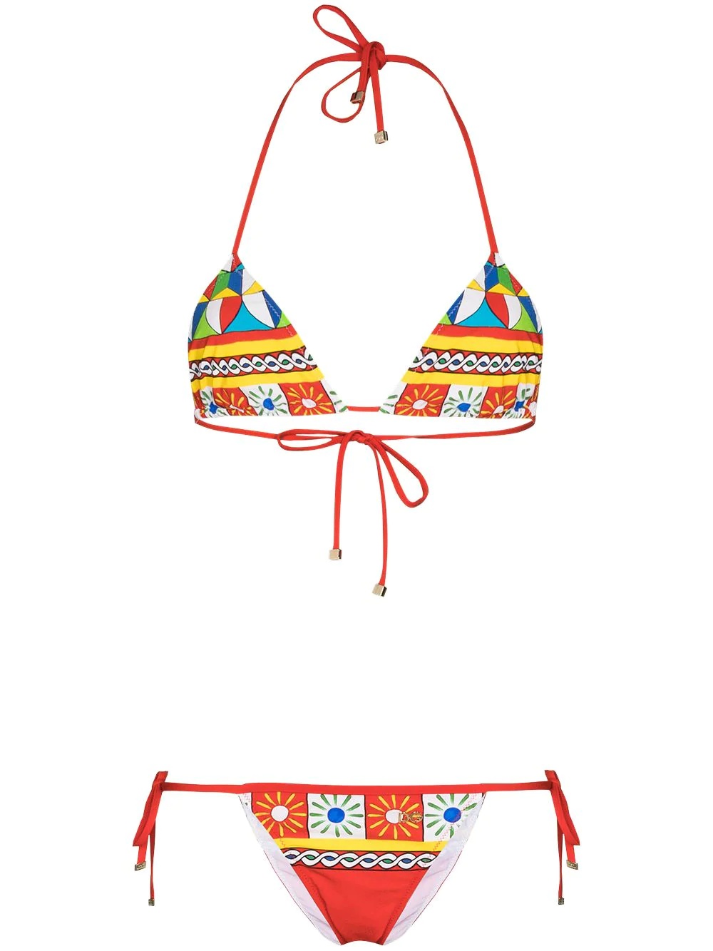 Carretto-print triangle bikini Adorned with a bright geometric print, this bikini from Dolce & Gabbana's AW21 collection features a triangle-shaped top with movable cups and an adjustable rear tie fastening, whilst its matching bottoms can be adjusted at the side. Highlights - Multicolour - Geometric print - Triangle cup - Rear tie fastening - Side tie fastening - Be mindful to try on swimwear over your own garments. Made in Italy Composition Polyamide 75%, Elastane 25% SIZE & FIT Model measurements Height 5 ft 9 in(1.76 m) Bust/Chest 33.07 in(84 cm) Hips 38.58 in(98 cm) Waist 24.8 in(63 cm) FittingInformation This piece fits true to size. We recommend you get your regular size Made with a mid-weight stretch fabric Washing instructions Hand Wash