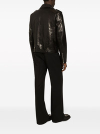 grained leather biker jacket Dolce & Gabbana presents its reinterpretation of the classic biker style. Boasting a traditional approach to the silhouette, it is crafted from black-grained leather and accented with multiple silver-tone zip detailing. Highlights - Black - Lambskin - Grained texture - Notched collar - Rivet detailing - Epaulettes - Off-centre front zip fastening - Multiple zip-fastening pockets - Long sleeves - Cuff zips - Belted waist - Silver-tone hardware - Straight hem Made in Italy Composition Lamb Skin 100%