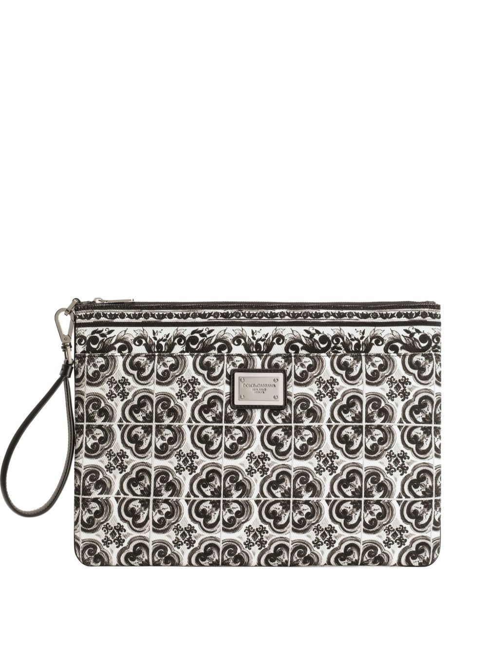 graphic-print leather clutch bag Highlights - Black - Wrist strap - Top zip fastening - Main compartment - Internal slip pocket Made in Italy Composition Outer: Cotton 90%, CALFSKIN 10% SIZE & FIT Measurement DEPTH 0.39 in(1 cm) HEIGHT 10.62 in(27 cm) WIDTH 14.96 in(38 cm)