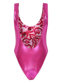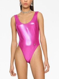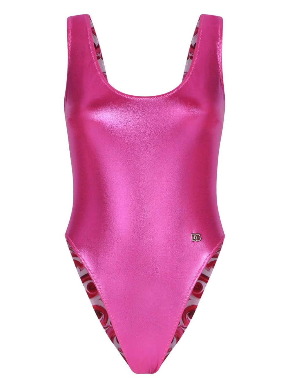 high-shine one-piece swimsuit Dolce & Gabbana's swimwear collection is filled with contemporary pieces boasting sensuality, and this swimsuit is the perfect example. Defined by its high-shine finish, it features a silver-tone DG logo and a scoop neck. Highlights - Fuchsia pink - Stretch-design - High-shine finish - Silver-tone logo lettering - Scoop neck - Sleeveless - Be mindful to try on swimwear over your own garments. Made in Italy Composition Lining: Nylon 77%, Spandex/Elastane 23% Outer: Nylon 87%, Spandex/Elastane 13%