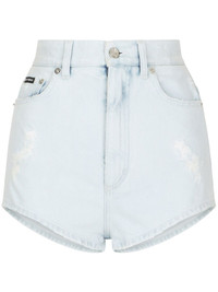 high-waisted denim shorts light blue stretch-cotton distressed effect logo plaque high waist button fly fastening belt loops classic five pockets Made in Italy Composition Cotton 98%, Spandex/Elastane 2% SIZE & FIT Measurement FRONT RISE 12 in(30.5 cm) INSIDE LEG 1.18 in(3 cm) HIPS 34.25 in(87 cm)