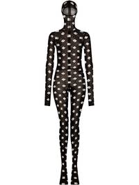 logo-print hooded jumpsuit Dolce & Gabbana's AW22 collection takes inspiration from modernity and the metaverse, reflected in the streamlined silhouette of this semi-sheer jumpsuit. Enveloped in the brand's iconic initials, the encompassing hooded silhouette and second-skin form embody the brand's futuristic vision. Highlights - Black/white - Stretch-design - Semi-sheer construction - All-over logo print - Hooded silhouette - Long sleeves - Thumb slot - Covers foot Made in Italy Composition Nylon 80%, Elastane 20% Washing instructions Machine Wash
