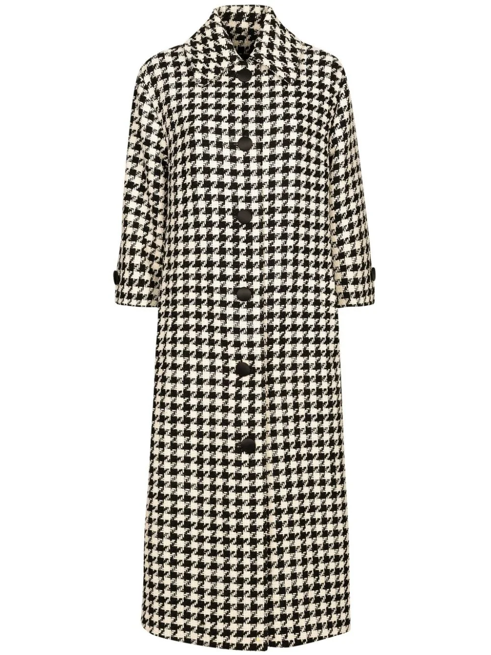 houndstooth trench coat Highlights - Black/white - Virgin wool blend - Houndstooth pattern - Long sleeves - Front button fastening - Draped side pockets - Classic collar - Straight hem Made in Italy Composition Outer: Virgin Wool 65%, Cotton 35% Lining: Silk 100%
