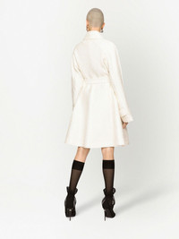 single-breasted brocade coat Cut for a knee-length and flared at the hem, this cream-white single-breasted trench coat belts at the waist for a defined silhouette and is defined by its jacquard texture throughout. Delicate DG buttons evoke Dolce & Gabbana's penchant for logomania. Highlights - Cream white - Cotton blend - Full jacquard - Front button fastening - Belted waist - Logo-engraved buttons - Two side slit pockets - Knee-length Made in Italy Composition Outer: Cotton 64%, Polyester 23%, Silk 13% Lining: Silk 92%, Spandex/Elastane 8%