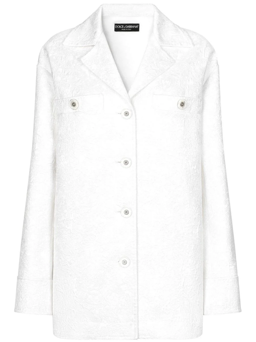 jacquard brocade coat Highlights - Optical white - Cotton-silk blend - Patterned jacquard - Notched lapels - Front button fastening - Long sleeves - Buttoned cuffs - Two front welt pockets - Straight hem Made in Italy Composition Outer: Cotton 64%, Rayon 36% Lining: Silk 92%, Elastane 8%