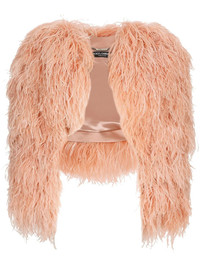 KIM DOLCE&GABBANA feather-trim bolero jacket Highlights - Peach orange - Silk blend - Open front - Long sleeves - Cropped Made in Italy Composition Outer: Ostrich Feather 100% Lining: Silk 92%, Elastane 8% SIZE & FIT Measurement SLEEVE LENGTH 18.5 in(47 cm) LENGTH 13.77 in(35 cm)