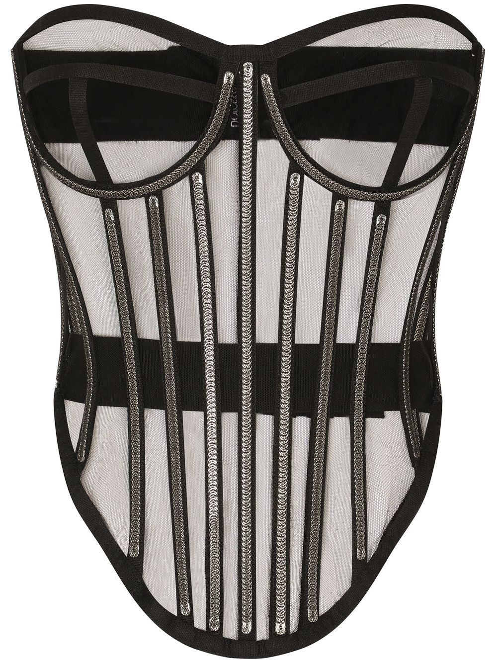 KIM DOLCE&GABBANA tulle corset top Dolce & Gabbana's bodysuit speaks to the brand's signature boudoir dressing. This lingerie-inspired piece has a semi-sheer tulle construction illuminated with sparkling crystals at the boned bodice. Highlights - Black - Tulle netting - Semi-sheer construction - Crystal embellishment - Sweetheart neck - Boned bodice - Rear hook and eye fastening - Just a reminder that this piece must be tried on over your own garments. Made in Italy Composition Lining: Silk 91%, Elastane 9% Outer: Nylon 100%