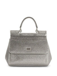 KIM DOLCE&GABBANA small Sicily satin top-handle bag Highlights - Silver-tone - Satin weave - Rhinestone embellishment - Palladium-plated hardware - Logo plaque - Single rolled top handle - Adjustable detachable shoulder strap - Embossed lizard-skin effect - Foldover top with magnetic fastening - Main compartment - Internal slip pocket - Internal logo stamp - Satin lining - This piece comes complete with a protective dust bag. Made in Italy Composition Lining: Rayon 50%, Silk 25%, Nylon 10%, Calf Leather 10%, Polyurethane 5% Outer: Rayon 55%, Silk 25%, Calf Leather 20%