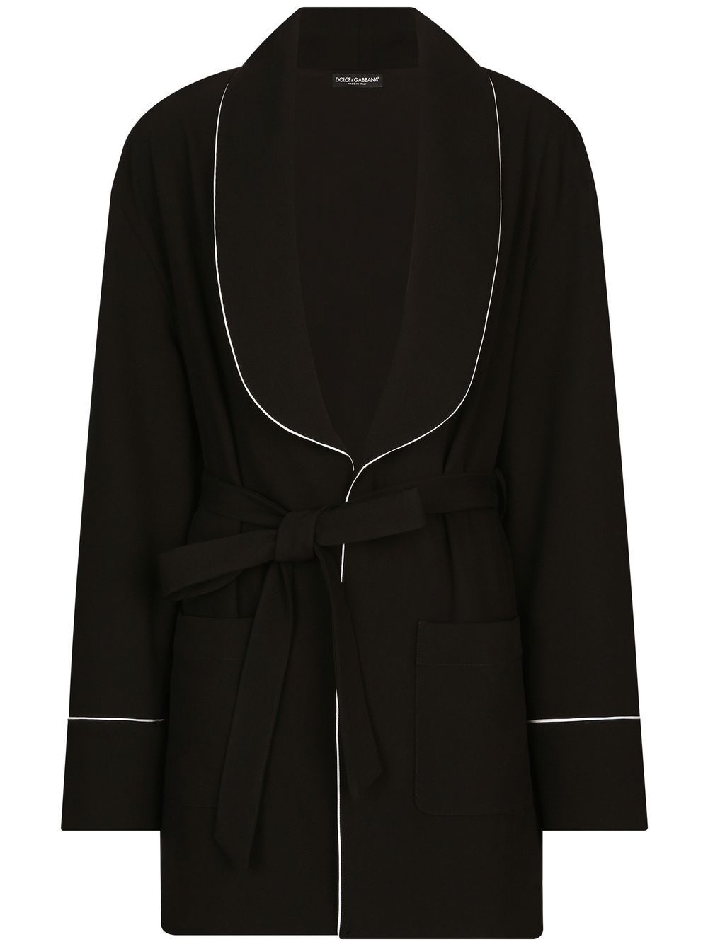 KIM DOLCE&GABBANA belted pajama shirt Highlights - Black - Virgin wool blend - Silk blend - Shawl lapels - Belted waist - Piped-trim detailing - Two front patch pockets - Long sleeves Made in Italy Composition Lining: Silk 91%, Elastane 9% Outer: Virgin Wool 98%, Elastane 2% SIZE & FIT Measurement SLEEVE LENGTH 24.01 in(61 cm) LENGTH 33.46 in(85 cm)