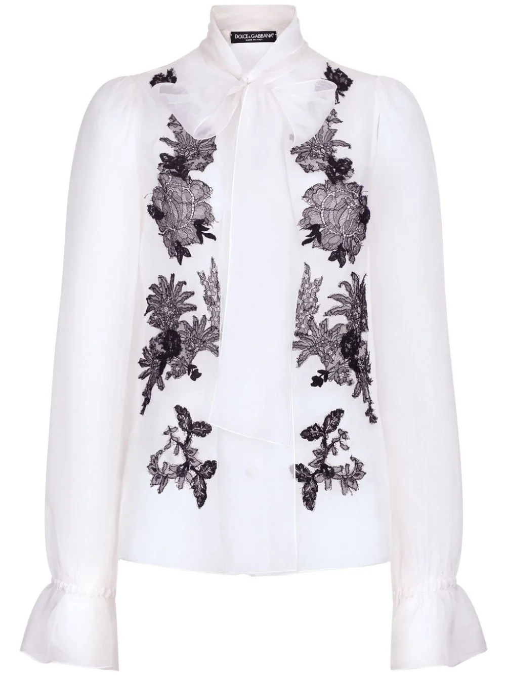 lace-applique silk-blend shirt Highlights - White/black - Silk blend - Floral lace applique - Organza panels - Ruffle cuffs - Pussy-bow fastening - Front button fastening - Long sleeves - Straight hem Made in Italy Composition Silk 75%, Cotton 23%, Polyester 2%