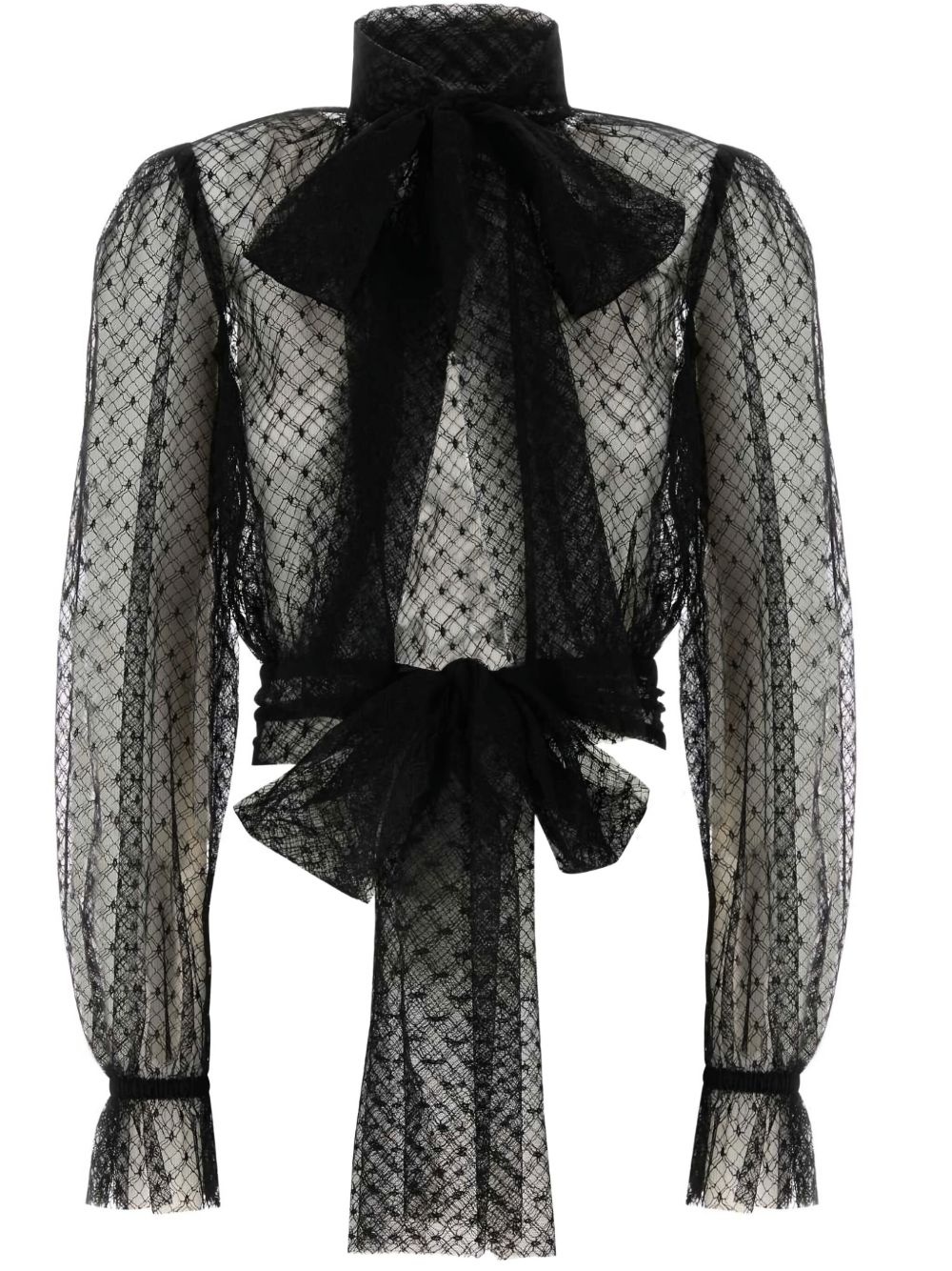 lace bow-detail blouse Highlights - Black - Sheer lace - High neck - Bow tie front - Long sleeves - Ruffled cuffs - Elasticated waistband - Diamond pattern Made in Italy Composition Nylon 100%