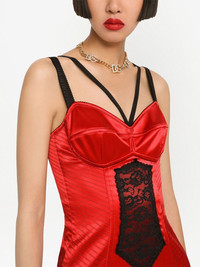 lace-detail satin minidress Dolce & Gabbana's SS23 collection brings to focus alluring designs inspired by lingerie styles. Showcasing the theme, this red minidress features a lace detail and a structured bustier. Highlights - Black/red - Silk blend - Boned bodice - Sweetheart neck - Adjustable spaghetti straps - Sleeveless - Thigh-length Made in Italy Composition Lining: Silk 92%, Spandex/Elastane 8% Outer: Acetate 58%, Nylon 36%, Spandex/Elastane 6%