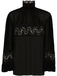lace-embellished high-neck blouse Highlights - Jet black - Silk blend - Chantilly lace embroidery - Ruched detailing - Keyhole detail to the rear - High neck - Rear button fastening - Long puff sleeves - Straight hem Made in Italy Composition Silk 80%, Cotton 13%, Nylon 6%, Rayon 1% Washing instructions Read Manufacturer Guidelines