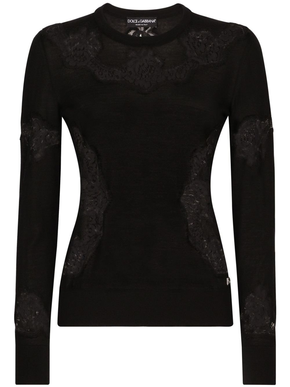 DNA lace-embroidered crew-neck jumper Highlights - Black - Cashmere blend - Knitted construction - Lace embroidery - Crew neck - Long sleeves - Ribbed hem Made in Italy Composition Cashmere 60%, Silk 25%, Cotton 12%, Polyamide 3% Washing instructions Read Manufacturer Guidelines