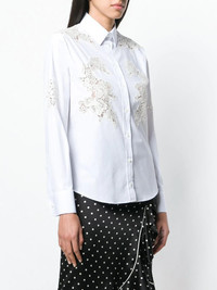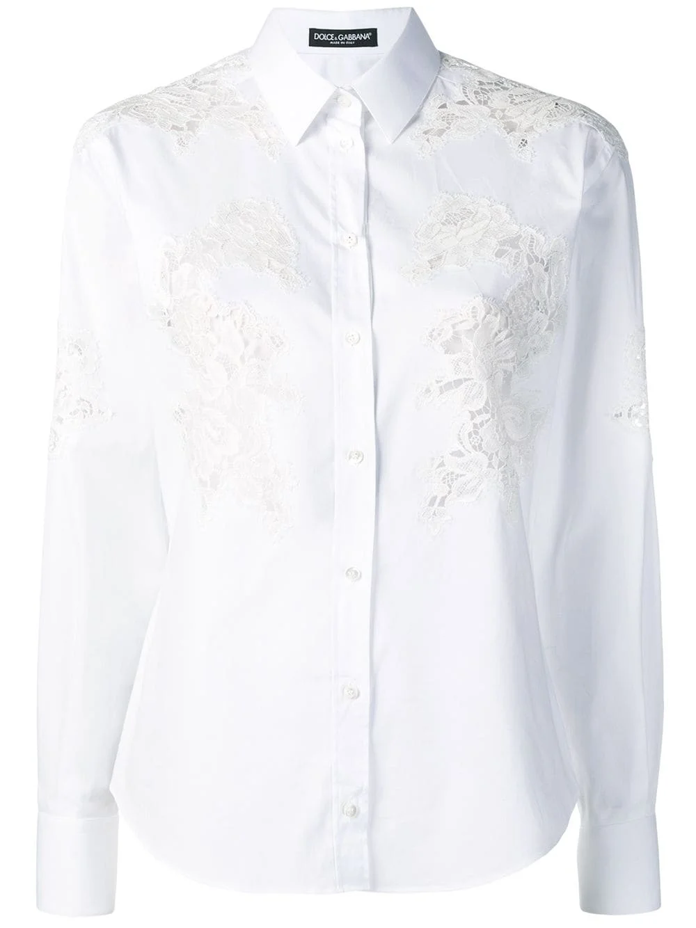 lace inserts shirt Dolce & Gabbana exude Sicilian elegance, taking inspiration from everyday Italian lifestyle. This shirt was crafted for SS19 from white stretch cotton. Showcasing sheer lace inserts all over, it features a classic collar, a front button fastening, long sleeves with button cuffs, a box pleat detail to the back and a curved hemline. Made in Italy Composition Cotton 78%, Viscose 10%, Polyamide 5%, Polyester 4%, Spandex/Elastane 3% SIZE & FIT Model measurements Height 5 ft 10 in(1.79 m) Bust/Chest 33.46 in(85 cm) Hips 35.43 in(90 cm) Waist 25.19 in(64 cm) Measurement LENGTH 26.37 in(67 cm) Washing instructions Dry Clean Only