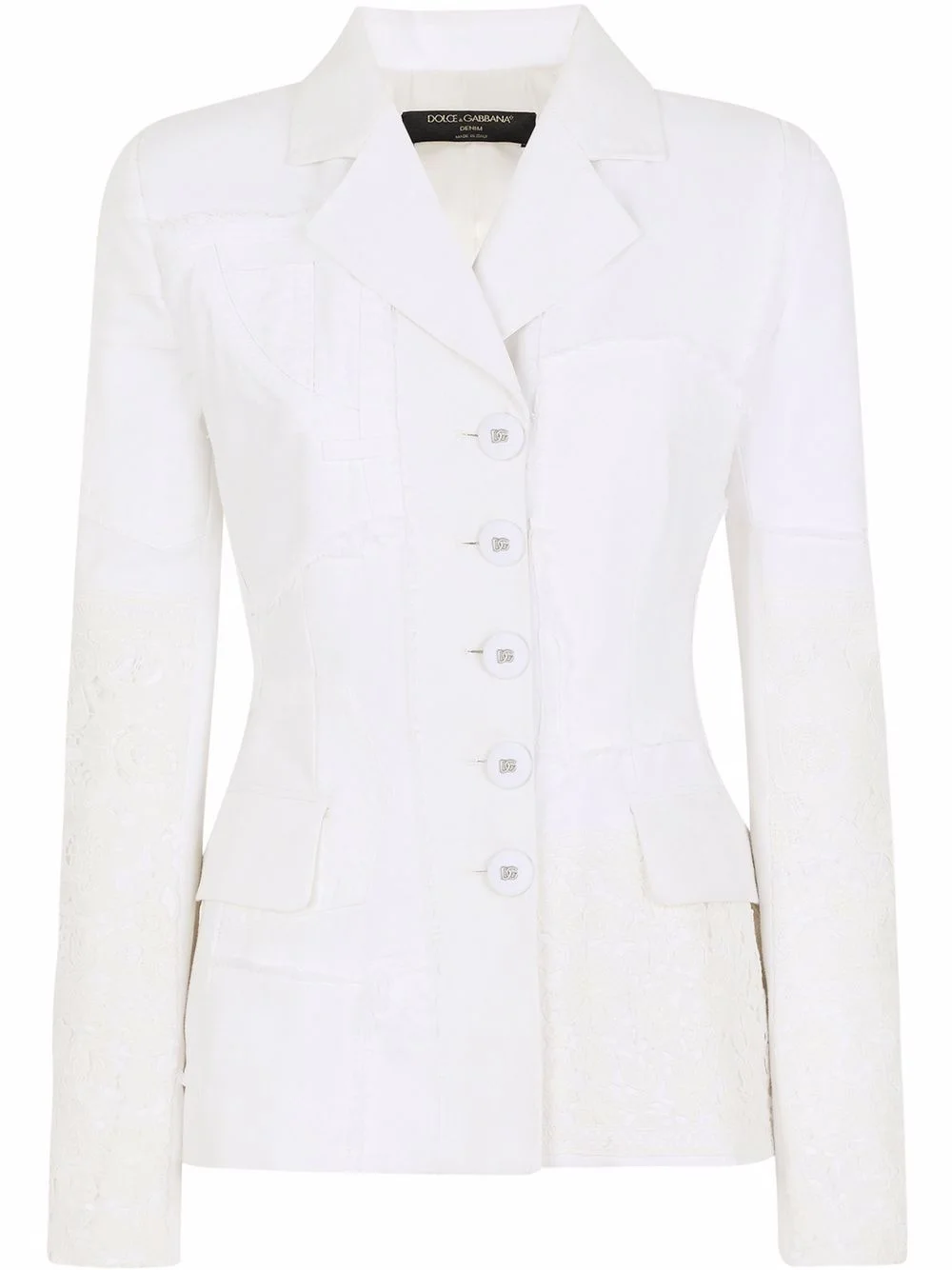 lace-patchwork single-breasted blazer Highlights - White - Silk-blend/cotton-blend - Lace panelling - Notched lapels - Front button fastening - Long sleeves - Two front flap pockets - Fitted silhouette Made in Italy Composition Lining: Silk 94%, Elastane 6% Outer: Cotton 93%, Polyester 5%, Elastane 2%