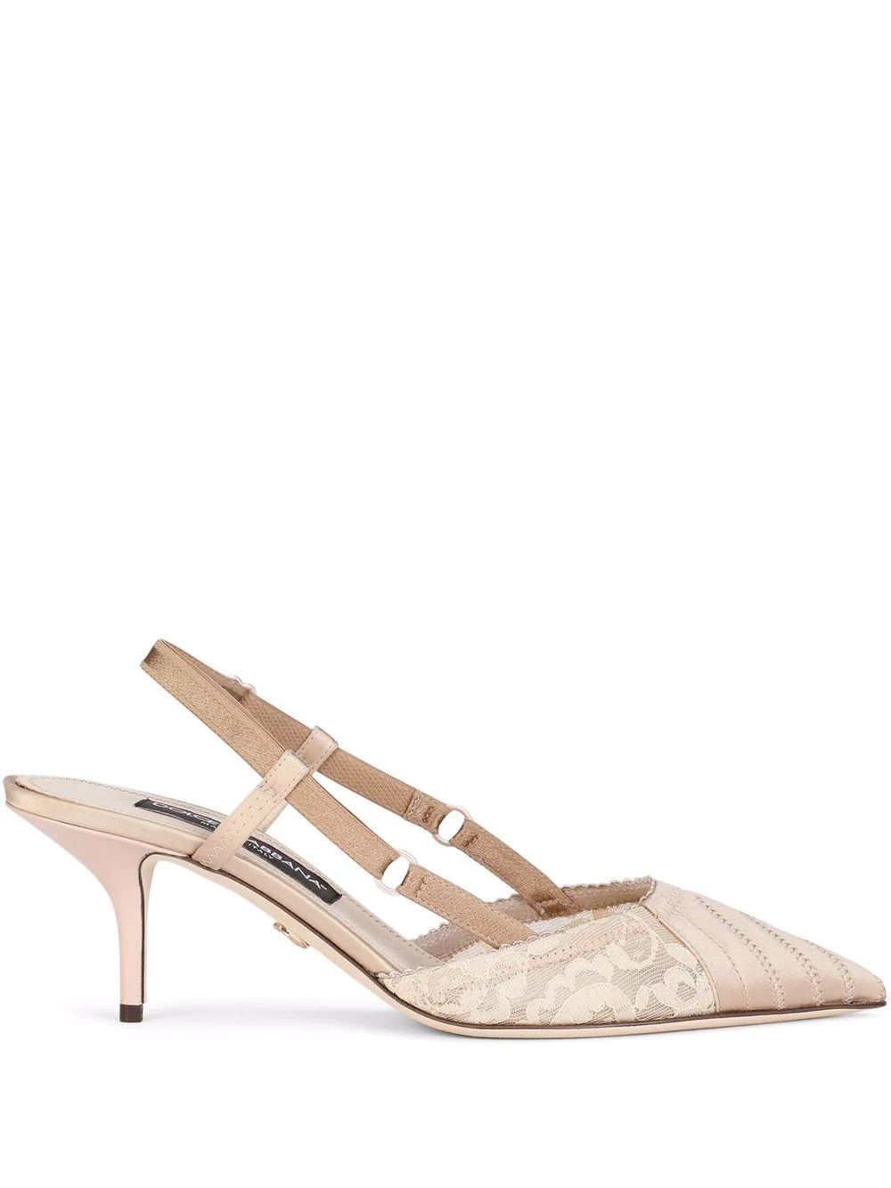 corset-style satin slingback pumps Highlights - Naked beige - Leather - Lace panelling - Pointed toe - Branded insole - Slingback strap - High stiletto heel Made in Italy Composition Outer: Nylon 85%, Spandex/Elastane 10%, Calf Leather 5% Sole: Leather 100% Lining: Nylon 100%