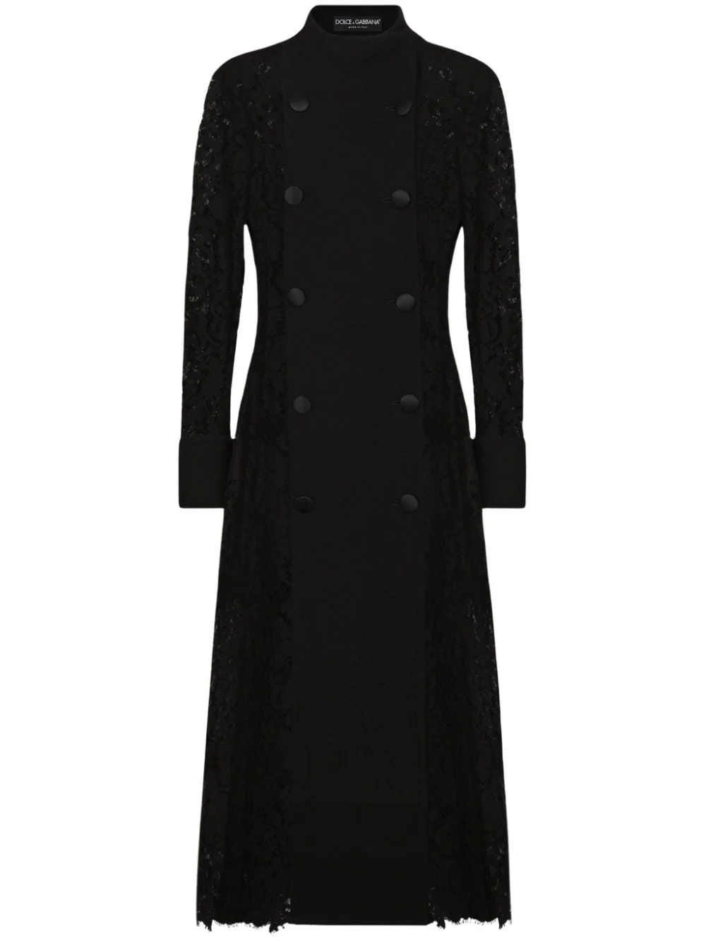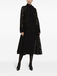lace-panelling coat Highlights - Black - Panelled design - Sheer lace panelling - Double-breasted button fastening - Long sleeves - Below-knee length - Straight hem Made in Italy Composition Outer: Cotton 35%, Wool 30%, Viscose 29%, Polyamide 6% Lining: Polyamide 100%