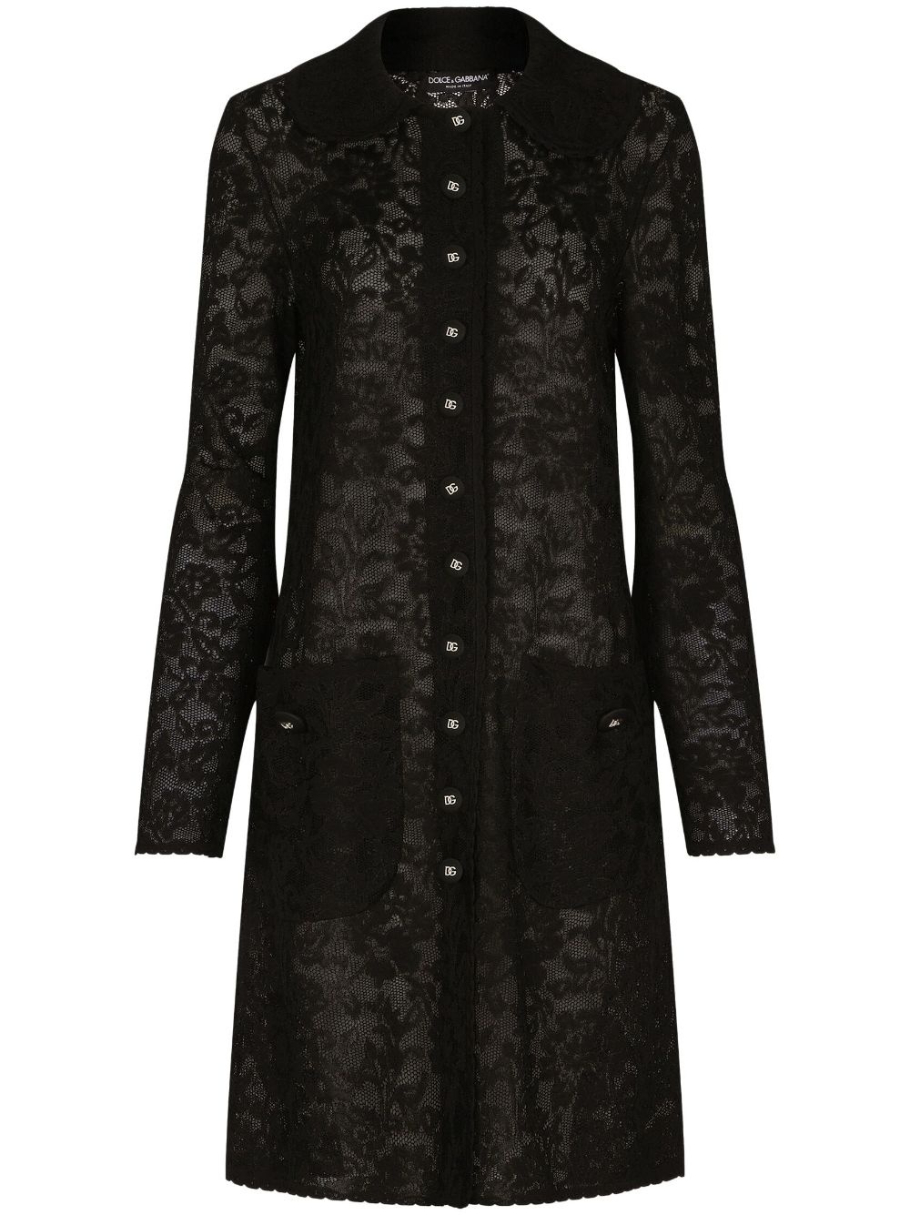 Lace-stitch DG jacket The elegant silhouette of this fitted Dolce & Gabbana jacket, is elevated by the floral lace throughout. At the front branded buttons fasten the piece with a recognisable touch. Highlights - Black - Floral-lace detailing - Logo-engraved buttons - Spread collar - Front button fastening - Long sleeves Made in Italy Composition Rayon 72%, Polyester 28%