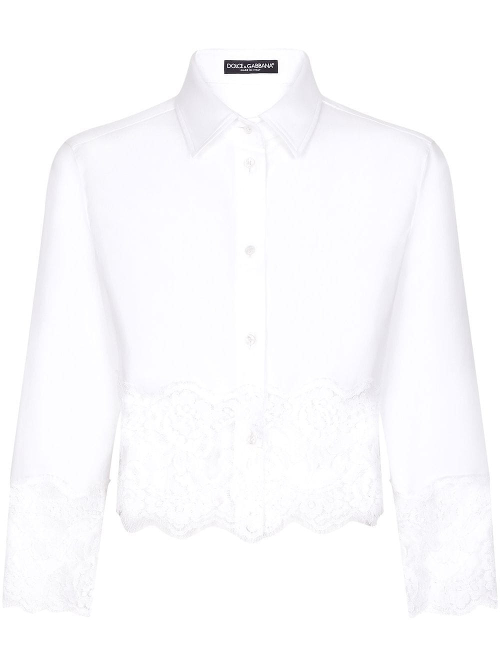 lace-insert cropped poplin shirt Dolce & Gabbana adds a textured element to this otherwise pared-back shirt silhouette. The design is crafted from cotton poplin and comes anchored with a contrasting lace trim to update the otherwise classic silhouette. Highlights - Lace-trim poplin shirt from dolce & gabbana featuring white, stretch-cotton, poplin texture, straight-point collar, front button fastening, long sleeves, lace detailing and cropped. Made in Italy Composition Cotton 94%, Nylon 4%, Elastane 2% Washing instructions Read Manufacturer Guidelines