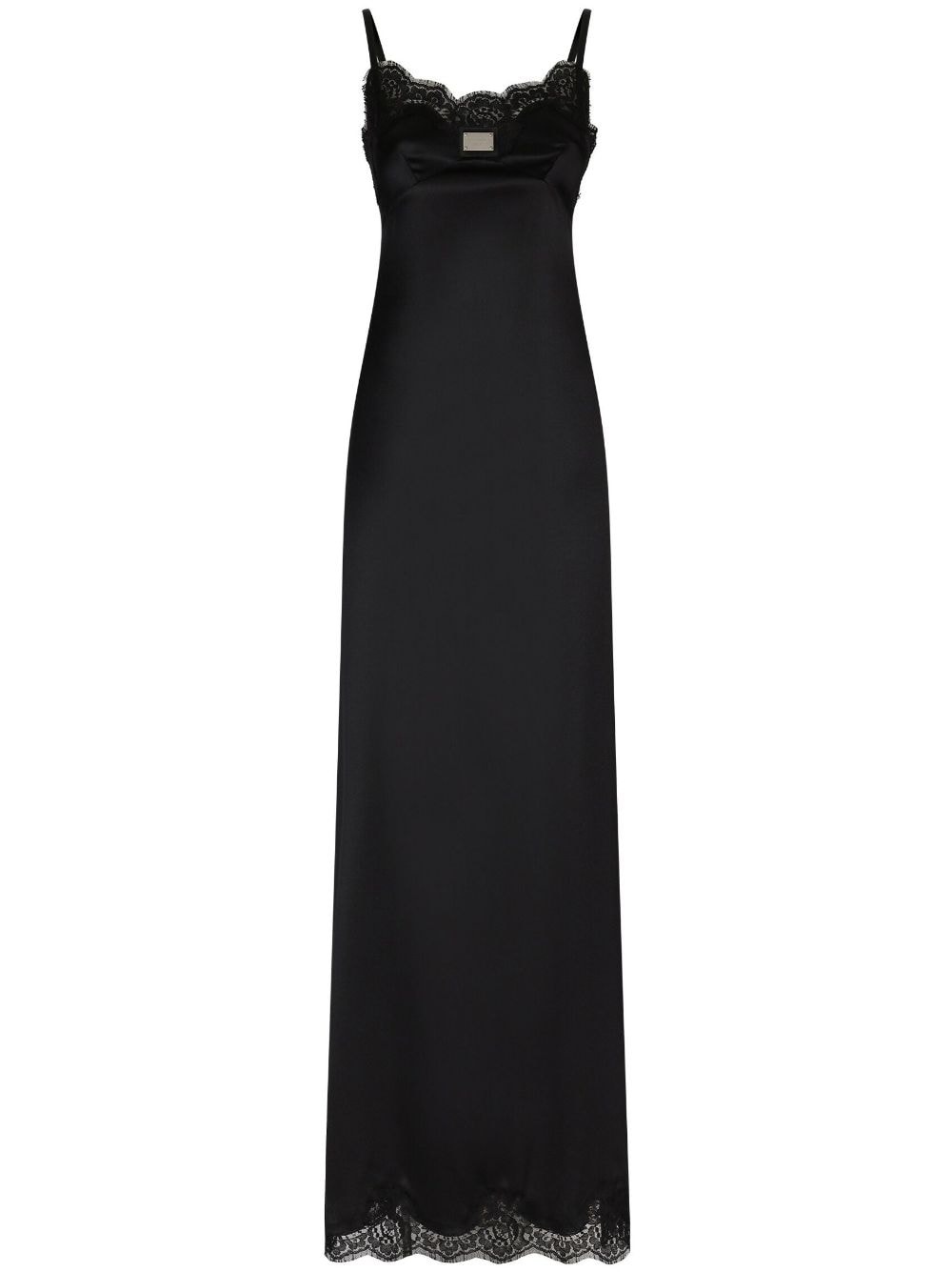 lace-trimmed satin gown Inspired by lingerie designs, this DOLCE & GABBANA black dress is crafted from a soft silk-cotton blend. The lace trim adds a romantic flair, while the silver-tone logo plaque that embellishes the front delivers a distinctive branding note. Highlights - Black - Silk-cotton blend - Lace trim - Silver-tone logo plaque - Sweetheart neck - Concealed rear zip fastening - Double-strap design - Maxi Made in Italy Composition Silk 77%, Cotton 16%, Nylon 4%, Elastane 3%