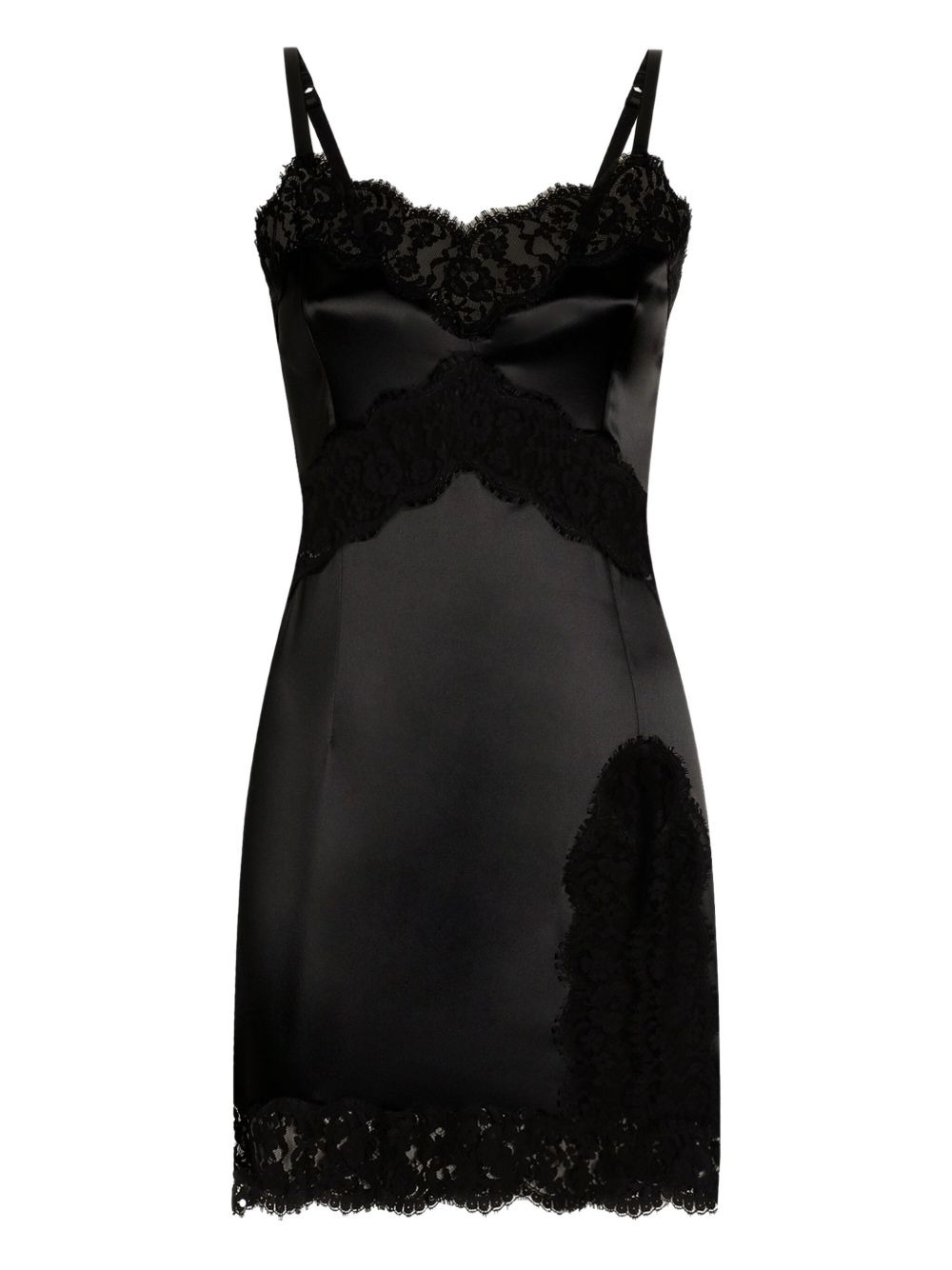 lace-trimmed satin slip mini dress Highlights - Black - Lace detailing - Adjustable spaghetti straps - Scalloped edge Made in Italy Composition Acetate 46%, Polyamide 26%, Cotton 24%, Spandex/Elastane 4% Washing instructions Read Manufacturer Guidelines