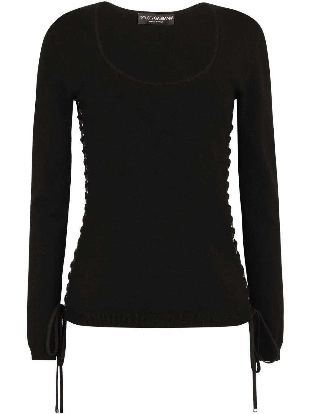 scoop-neck lace-up jumper Highlights - Black - Scoop neck - Long sleeves - Lace-up detailing - Straight hem Made in Italy Composition Rayon 83%, Polyester 17%