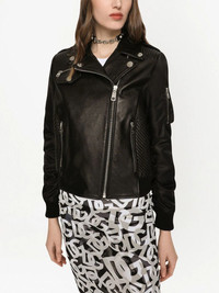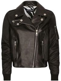 leather biker jacket Made from a leather construction with contrasting nylon sleeves, this biker jacket from Dolce & Gabbana's AW22 collection is a prime example of how the house updates a timeless style with a contemporary appeal. Highlights - Black - Leather - Panelled design - Silver-tone hardware - Logo-embossed buttons - Press-stud fastening collar - Off-centre front zip fastening - Long sleeves - Two side zip-fastening pockets - Sleeve zip pocket Made in Italy Composition Outer: Bos Taurus 60%, Nylon 40% Lining: Polyester 97%, Elastane 3%