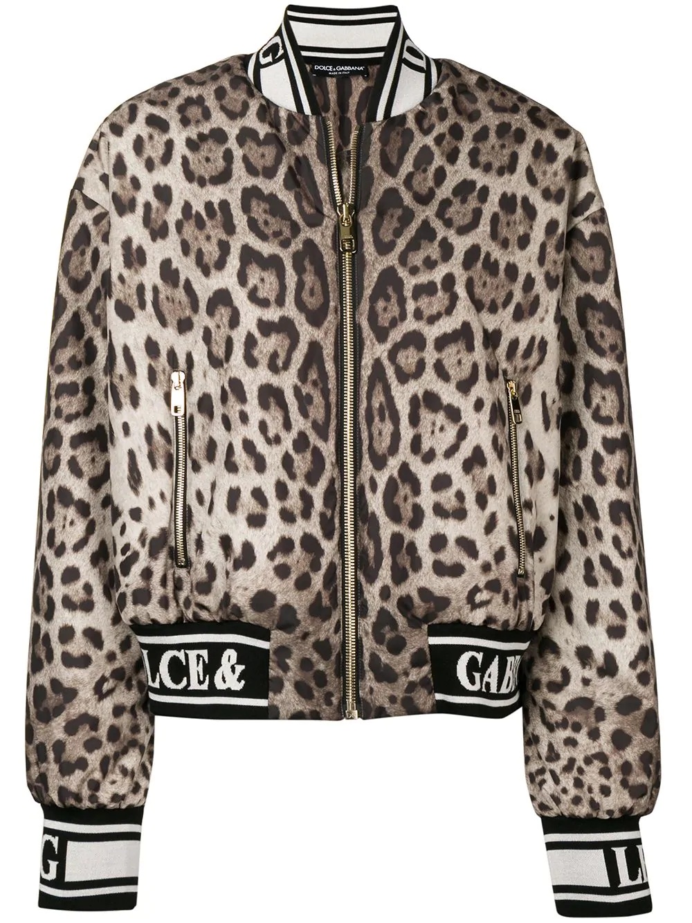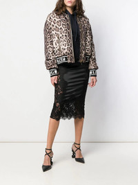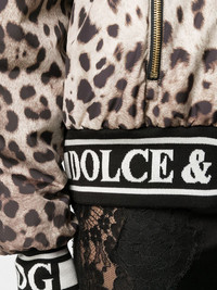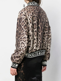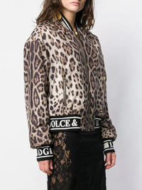leopard-print bomber jacket Highlights - Fashion’s love affair with leopard print is notably present in the glamorous world of domenico dolce and stefano gabbana. forming an integral part of dolce & gabbana's designs, the black spotted tawny coats of large felines has become synonymous with the italian maison, decorating pieces and accessories for countless collections. crafted in italy from tonal brown stretch silk, this leopard print bomber jacket from dolce & gabbana features a shawl collar, a front zip fastening, front zipped pockets, long sleeves and a black and white elasticated logo trim. Made in Italy Composition Outer: Polyester 100%, Silk 96%, Spandex/Elastane 4% Lining: Polyester 100% SIZE & FIT Model measurements Height 5 ft 9 in(1.75 m) Bust/Chest 32.67 in(83 cm) Hips 36.22 in(92 cm) Waist 24.8 in(63 cm) Washing instructions Dry Clean Only