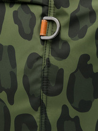 Nylon travel bag with leopard print against a green background and branded plate