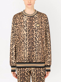 leopard-print jersey sweatshirt Dolce & Gabbana embraces bold print, as showcased by this sweatshirt. Decorated in an all-over leopard print, this stripe-trim top features a gold-tone logo plaque at the chest. Highlights - Brown - All-over leopard print - Stripe trim - Gold-tone logo plaque - Round neck - Drop shoulder - Long sleeves - Straight hem Made in Italy Composition Polyester 58%, Cotton 42%